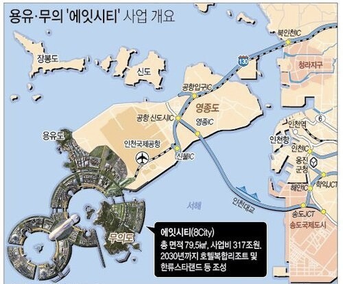 2012년 송영길 당시 인천시장이 의욕적으로 추진하다가 좌초되었는데, 우리가 알고 있는 2기 신도시 전체인 판교, 송파, 동탄1, 동탄2, 광교, 김포, 파주, 양주, 검단, 평택 등 수도권 10개와 아산, 대전 서남부 등 충청권 2개의 사업비가 104조원인데 반해 에잇시티 하나의 프로젝트가 무려 317조원 규모여서 당시부터 설왕설래가 많았던 사업이였습니다.