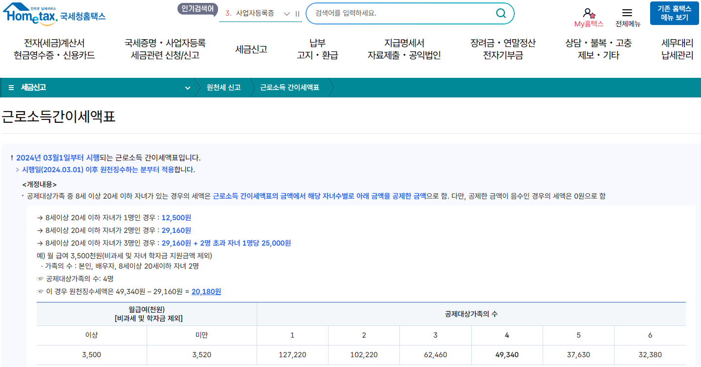- 급여 지급 시 원천징수해야 할 세액을 간단히 조회할 수 있도록 국세청에서 제공